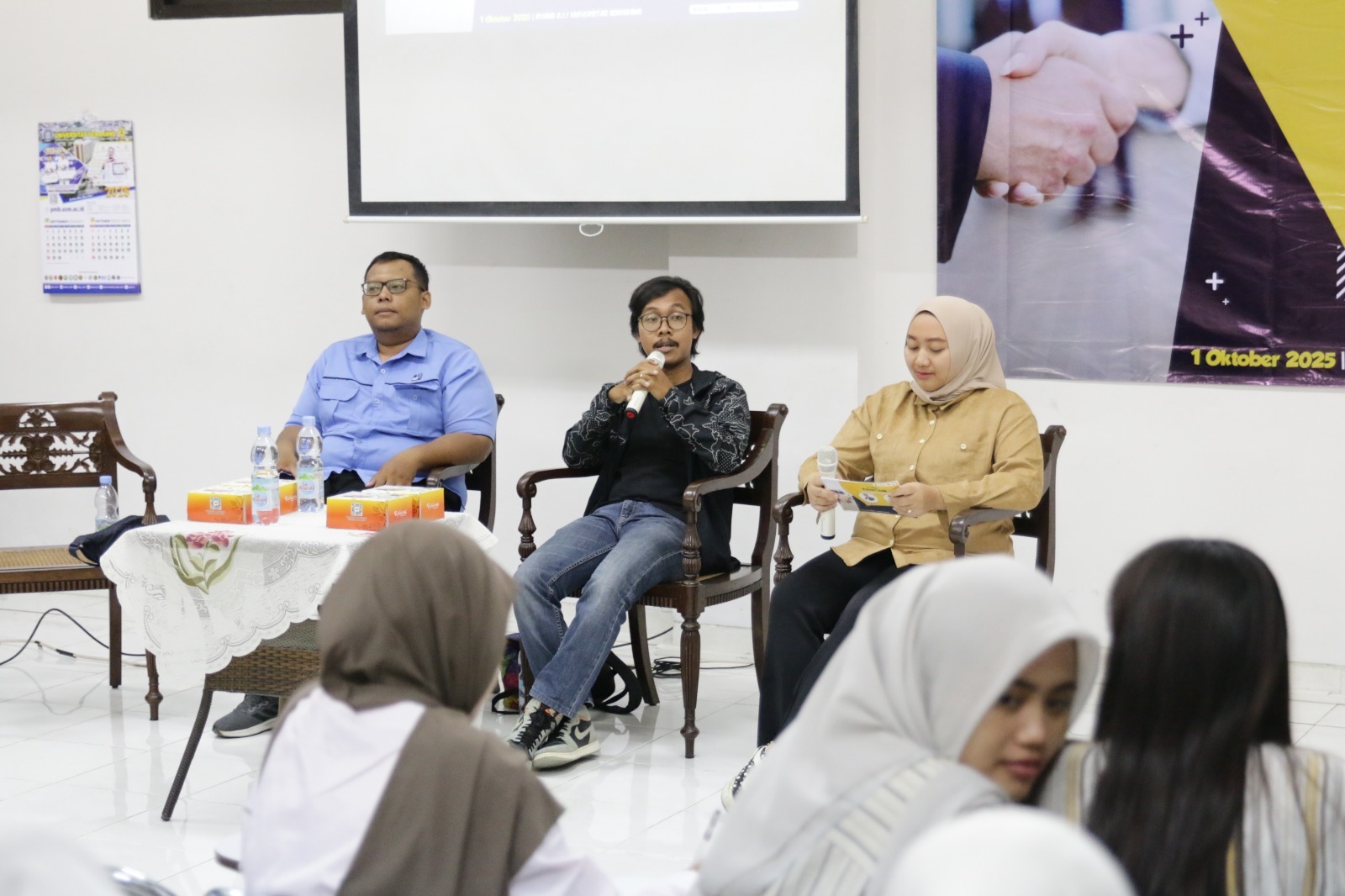 Kegiatan menghadirkan narasumber alumni, Sebastian Gery Prakoso SIKom (Supervisor Digital Marketing Marifood Group) dan Reposter RRI, Lucky Setiawan SIKom.