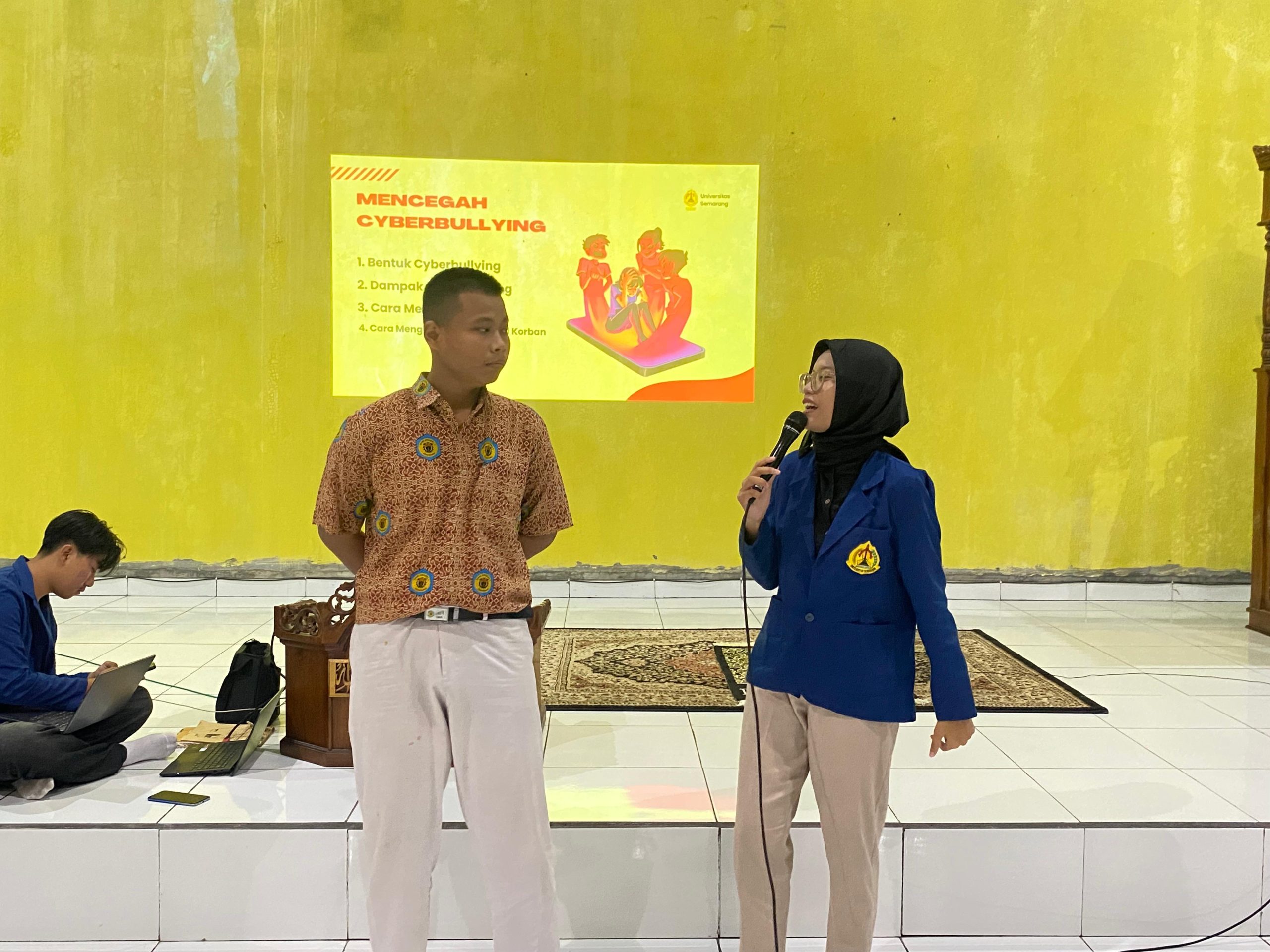 Mahasiswa penyelenggara dan siswa SMK Negeri 1 Semarang berdiskusi mengenai studi kasus cyberbullying dalam sesi penyampaian pendapat.