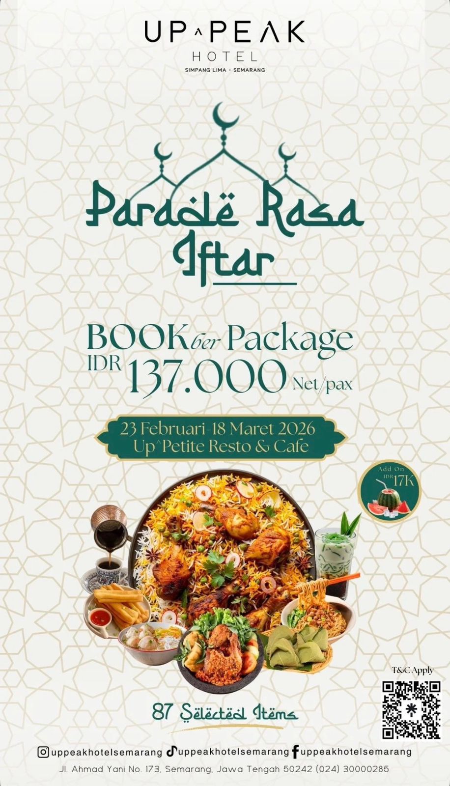 SEMARANG (Awall.id) – Menyambut bulan suci Ramadan 1447 Hijriah, Up^Peak Hotel Simpang Lima Semarang menghadirkan program berbuka puasa spesial bertajuk “Parade Rasa Iftar”. Program ini menawarkan pengalaman berbuka puasa dengan sajian kuliner nusantara dan internasional yang dirancang untuk dinikmati bersama keluarga maupun rekan kerja.