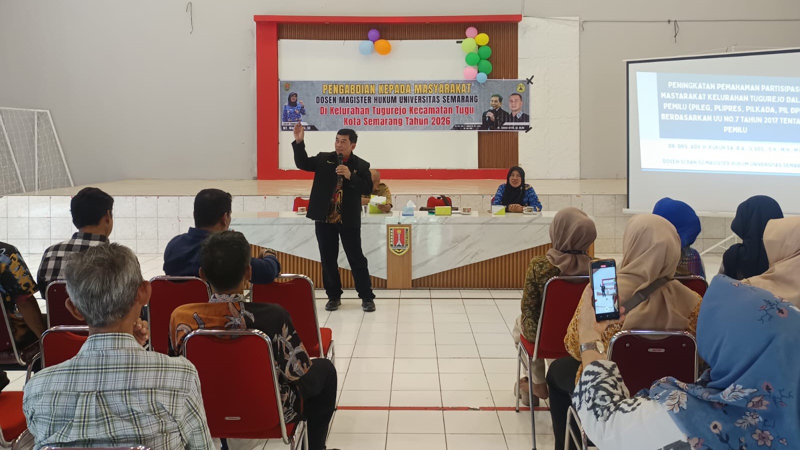 SEMARANG (Awall.id) – Tim Pengabdian kepada Masyarakat dosen magister hukum Universitas Semarang (PkM USM) memberikan Sosialiasi Hukum tentang Peningkatan Partisipasi Masyarakat dalam Pilkada, Pilpres, Pileg dan Pil-DPD berdasarkan UU Nomor 7 Tahun 2017 tentang Pemilu” di Balai Kelurahan Tugurejo, Kecamatan Tugu, Kota Semarang, pada 27 April 2026.