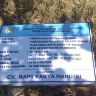 KENDAL (Awall.id) – Kelompok Tani Bulusan kecewa terhadap Pembangunan Rehabilitasi dan Pemeliharaan jalan usaha Tani Kelompok Tani Bulusan desa Sekucing Kecamatan Rowosari, Kabupaten Kendal, Selasa (10/10). Salah...