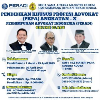 SEMARANG (Awall.id) – Program Studi Magister Hukum Universitas Semarang (USM) bekerja sama dengan Dewan Pimpinan Cabang Perhimpunan Advokat Indonesia Cabang Kendal menyelenggarakan Pendidikan Khusus Profesi Advokat (PKPA)...